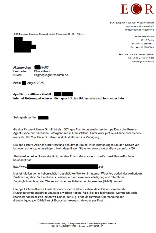 - Nicht selbst antworten: Vermeiden Sie jeglichen direkten Kontakt mit der ECR, der dpa Picture-Alliance GmbH oder der KSP Rechtsanwaltskanzlei. Jede unüberlegte Äußerung kann gegen Sie verwendet werden. Überlassen Sie die Kommunikation Ihrem erfahrenen Anwalt.