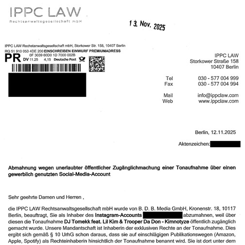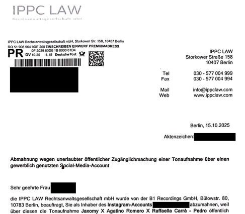 - Update 30.09.2025 – IPPC LAW mahnt für B1 Recordings GmbH wegen Instagram-Reel ab