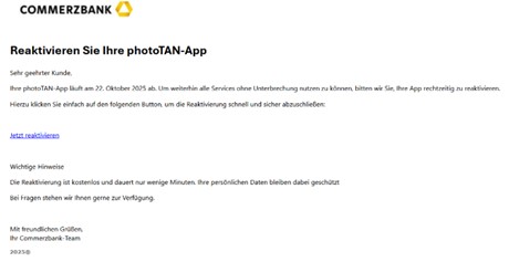 Die kriminellen Absender verschicken Nachrichten unter der Betreffzeile „Reaktivieren Sie Ihre photoTAN-App“ an ahnungslose Verbraucher. In diesen gefälschten Mitteilungen wird behauptet, die TAN-Anwendung der Empfänger verliere am 22. Oktober 2025 ihre Gültigkeit und erfordere eine sofortige Aktualisierung.