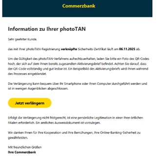 Kriminelle setzen derzeit verstärkt auf eine besonders raffinierte Phishing-Strategie, die sich gezielt an Commerzbank-Kunden richtet. Die Cyberkriminellen behaupten in ihren gefälschten Nachrichten, dass die mit dem jeweiligen Endgerät gekoppelte photoTAN-Funktion ihre Gültigkeit verliert und umgehend erneuert werden müsse.